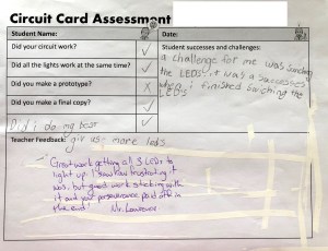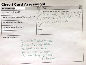 Once students had completed their circuit cards they were required to also complete a self assessment. Students were each given feedback that celebrated their successes, empathized with their frustrations, and gave direction for the future.