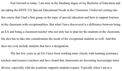 For many years before entering the teacher education program at Vancouver Island University I worked as an Education Assistant with School District 79 and a Community Support Worker with Clements Centre Society working with youth with special needs. Inclusion has always been a focus for me when supporting any youth with special needs as I have found many can mistake integration with inclusion. In my EDTE 532 Special Education course we were required to compose a final reflection paper on our commitment to inclusion. In this paper I outlined my experiences with the evolution of inclusion as I have seen it over the past 25 years working with youth with special needs. It has always been my goal to ensure students with special needs take part in the same opportunities as their peers either in school or in the community. I have been fortunate to learn from some of the pioneers in inclusion during my time in special education.