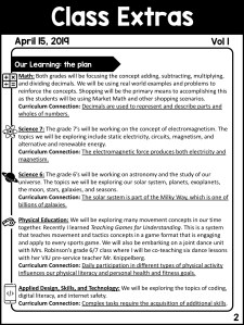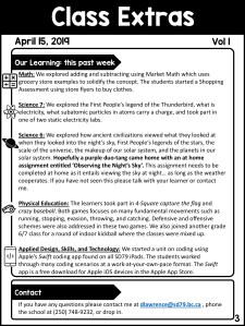 My initial idea was to distribute the newsletter via email, but the classroom teacher informed me that despite the best efforts of the school half of the emails for the class did not work. I decided to go the paper copy route and distribute an class newsletter on Friday that would summarize what the learning for the week was and what could be expected coming up. I included my contact information for any questions or feedback and I did receive responses from a few families thanking me for the information.