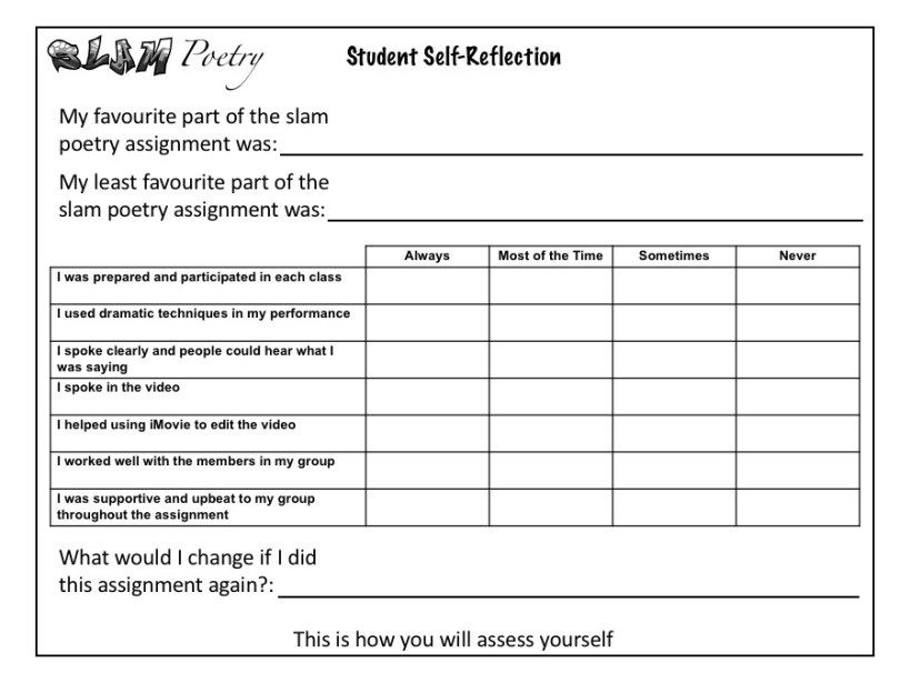 When working with students I have found that it works best if you are able to take what the BIG IDEAS and CONENT from the curriculum and work with the students to develop the criteria for what quality looks like. During the Slam Poetry unit that I co-taught my teaching partner and I created a video of what we thought a developing and proficient video looks like. We then worked with the students to refine what they felt would constitute a developing and proficient video.